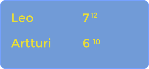 Tässä on esimerkiksi tulostaulu, jossa Leo vie voiton tie-breakin jälkeen. Tässä Leo teki 12 tie-break-pistettä ja Artturi 10. Leo voitti 2 pisteellä, joten hän voitti tie-breakin ja siten seitsemännen pelin ja kyseisen erän.